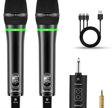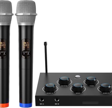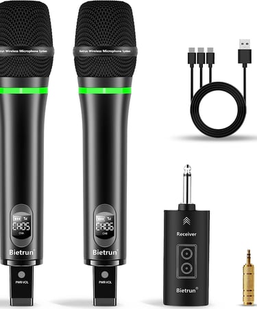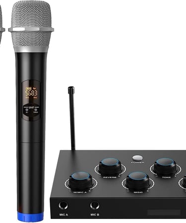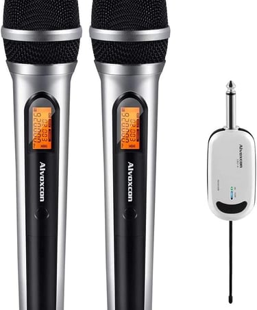 -ALVOXCON: Este sistema de micrófono de mano inalámbrico de 2 canales (dos micrófonos incluidos) produce un sonido claro y nítido con un rendimiento estable. El emparejamiento automático de frecuencia hace que sea fácil de configurar.