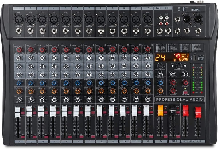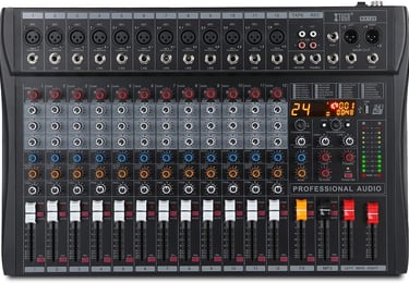 Mezclador de audio multiusos de asta 12 canales de ruido ultra bajo. Equipado con XLR dorados e interfaz de entrada de línea equilibrada, con puntos de inserción. Entrada XLR equilibrada (Canon), puede conectar un conector macho estándar Canon, con fuente de alimentación Phantom de +48 V.